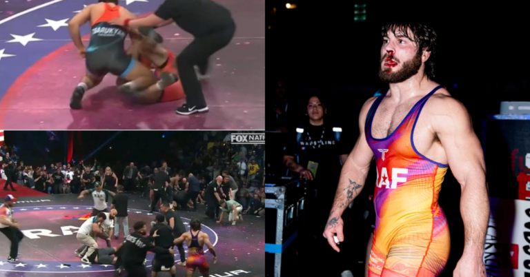 “Arman Tsarukyan wins his match after which tackles Georgio Poullas to the bottom and begins punching him, and a full-on melee breaks out”