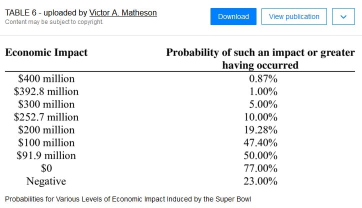 “Once we take a look at knowledge for cities that hosted the Tremendous Bowl, they normally get a rise in financial exercise of $50 million to $150 million … That’s not nothing, however a fraction of the $400 million to $600 million quantity thrown round by the boosters” – San Francisco,05/20/23, Victor Matheson, Sports activities Economist at Holy Cross and co-author of “The Economics of the Super Bowl: Players, Performers, and Cities.”